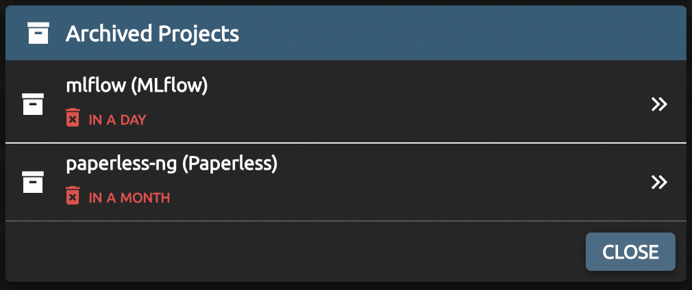 If the Project has Stages, it will be archived first. You can restore it, including all Stages, without loosing any configuration or persistent storage until the actual deletion is due. An overview of archived Projects is available at the bottom of the Projects overview page: