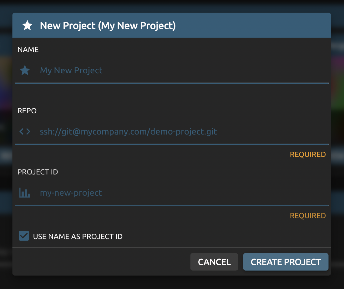 Press the '+ NEW PROJECT' button on the start page or under the 'Projects' navigation. This will open a popup: