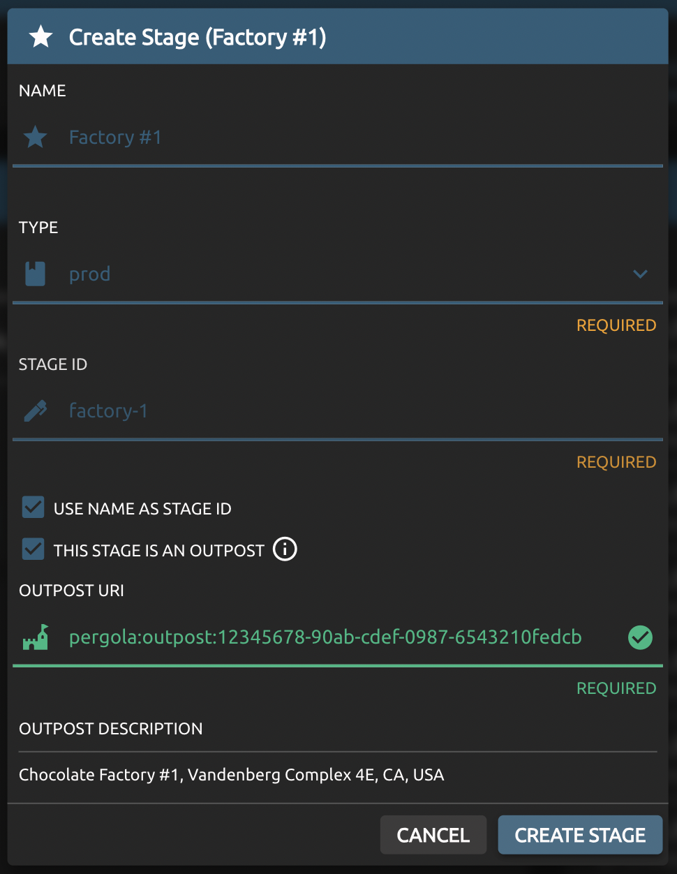 The only difference: Make sure the "THIS STAGE IS AN OUTPOST" checkbox is enabled and enter the Outpost URI provided by your administrator prior to creating the new Stage, as below: